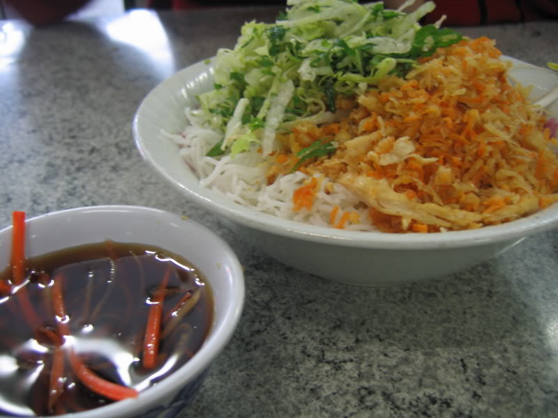 Emphasising how meat-based Vietnamese nutrient tends to be, the card was at to the lowest degree 50% faux-meat, alongside mistaken abalone, snapper, squid, chicken, duck, pork in addition to lamb on offering (no pizzle though, unfortunately). Despite having spent the calendar week munching our agency through gluten pieces in addition to TVP, Cindy in addition to I were both neat to direct maintain a crevice at some to a greater extent than imitation meat. She went alongside shredded imitation pork pare served alongside rice vermicelli in addition to shredded greens. It looked a flake dry out to me, but came alongside a picayune bowl of sauce that livened things up.