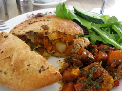 Michael zeroed inward apace on the Vegani pie ($9.80, including salad), a spelt-based crust stuffed alongside tofu as well as a diversity of vegetables alongside a little sum of spiced kokosnoot gravy.